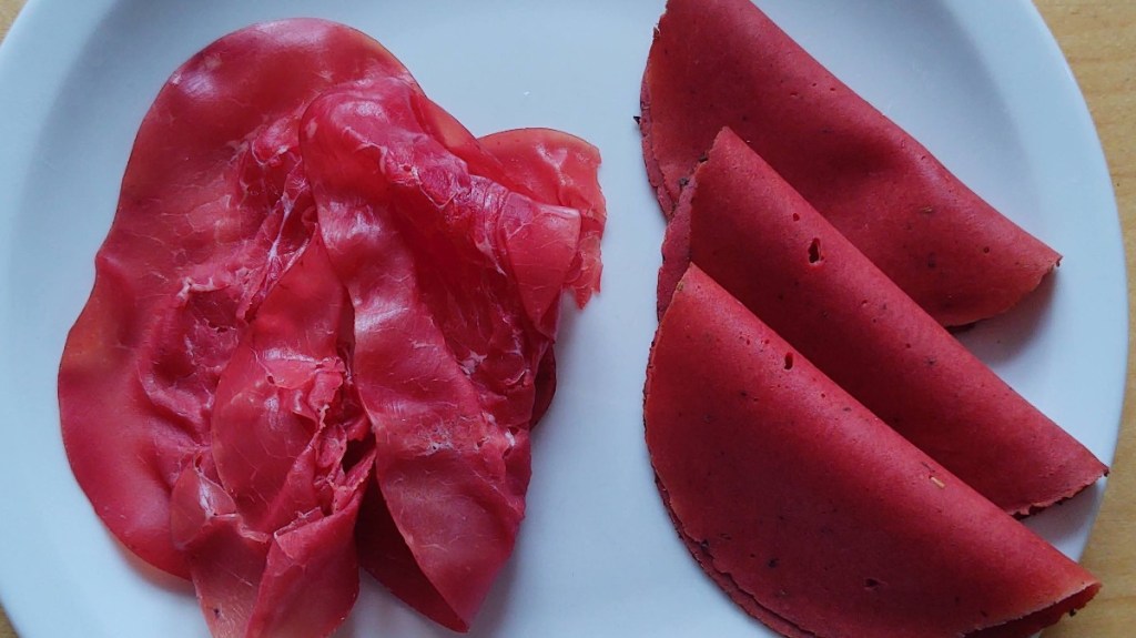 | Smag | Tydelig smag af tørret, krydret kød med lang eftersmag. | Ubestemmlig sødlig smag. Let kunstig smag. Smager ikke som sådan af kød eller planter. Bastante skiver for “Bresaola” |